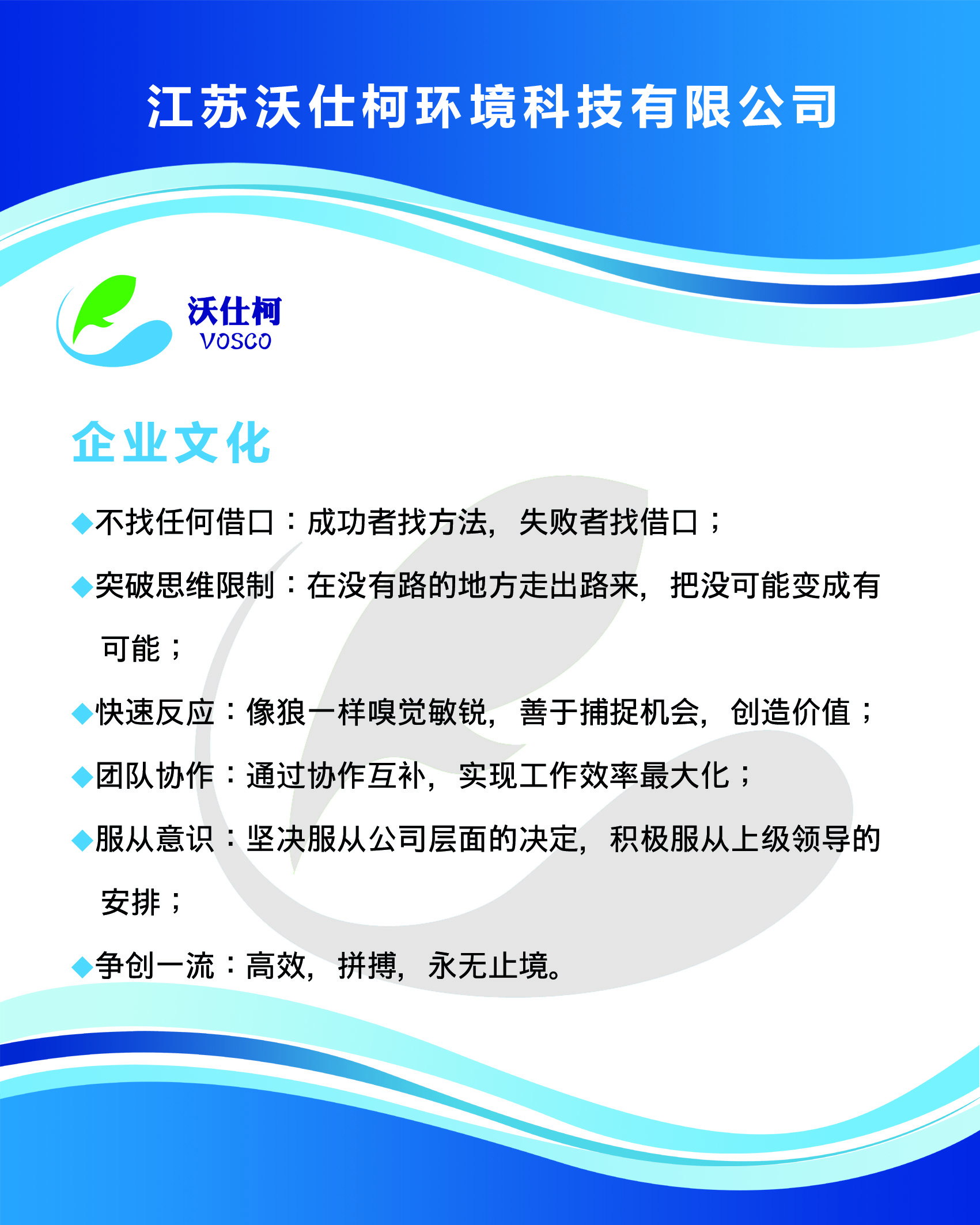 我們的企業(yè)文化是:不找任何借口、突破思維限制、快速反應(yīng)、團(tuán)隊(duì)協(xié)作、服從意識(shí)、爭(zhēng)創(chuàng)一流。